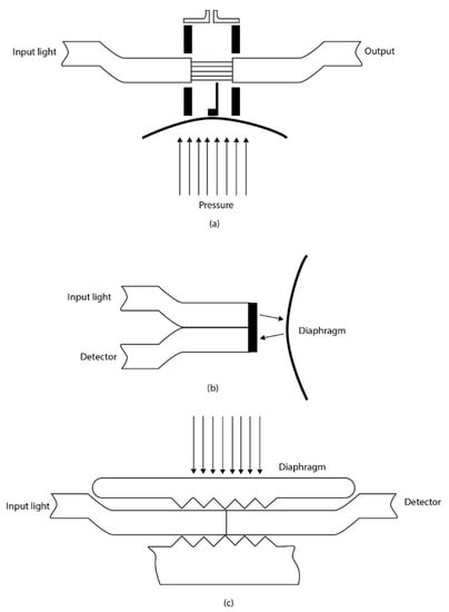 Intensity modulated-based sensing class; (a) Transmission intensity (b) Reflection intensity (c) microbending intensity type [52].