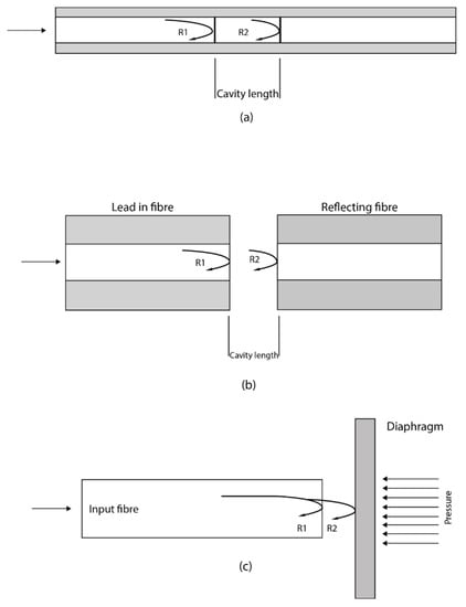 Different Fabry–Perot configurations (a) Illustration of IFPI formed with a single optical fibre (b) Arrangement of an EFPI formed using two optical fibres and (c) Schematic of an FP cavity formed using an optical fibre as the lead-in fibre and a deformable diaphragm [52].