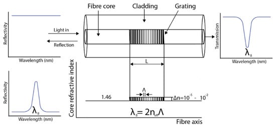 Fibre Bragg grating can be produced from a standard single-mode optical fibre. The core of the fibre is exposed to two ultra-violet light beams originating from the same laser source, the UV light beams constructively and destructively interfere (Figure 9). The result is a grating recorded into the fibre as a periodic variation of the refractive index of the fibre core. When light is propagated into the fibre, a narrow waveband of light is reflected back at the grating while other wavelengths of light are transmitted. The wavelength of the reflected light varies with the period of the grating which itself varies with both strain and temperature. The central wavelength of the reflected signal is generally called the Bragg wavelength () and it has a linear relationship between the refractive index and the period of the grating . This means that any variation in strain and temperature to which the optical fibre is subjected can cause a shift in the Bragg wavelength. The effective refractive index is is a physical characteristic of the fibre-optic material in which the grating is formed, while the grating period depends on the design of the grating. The changes in temperature and applied strain on the grating of the fibre directly modify the refractive index or the grating period of the fibre, respectively [52].