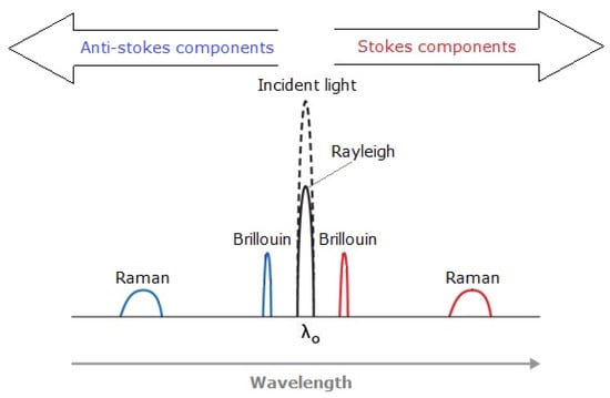 Backscattered spectrum with Rayleigh, Brillouin and Raman bands, as well as the stokes and anti-stokes bands.