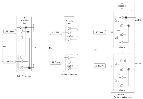 Spectral Efficiency (SE) of point-to-point transmissions is a major concern in SingleUser (SU) and MultiUser (MU) systems. To achieve good performances, it is necessary to develop algorithms that are specially tailored to the architecture of these systems. Several hybrid precoding schemes have been proposed in the literature [15,16,17,18,19]. The authors of [15] proposed two algorithms for low-complexity hybrid precoding and beamforming for MU mmWave systems. Even though they assume only one stream per user, i.e., the number of data streams (Ns) is equal to the number of users (Nu), it is shown that the algorithms achieve interesting results when compared to the fully-digital solution. The concept of precoding based on adaptive RF-chain-to-antenna was only introduced in [16] for SU scenarios, but showed promising results. In [17], a nonlinear hybrid transceiver design relying on Tomlinson–Harashima precoding was proposed. Their approach only considers Fully-Connected (FC) architectures but can achieve a performance close to the fully-digital transceiver. A Kalman-based Hybrid Precoding method was proposed for MU scenarios in [18]. While designed for systems with only one stream per user and based on fully-connected structures, the performance of the algorithm is competitive with other existing solutions. A hybrid MMSE-based precoder and combiner design with low complexity was proposed in [19]. The algorithm is designed for MU-MIMO systems in narrowband channels, and it presents lower complexity and better results when compared to Kalman’s precoding. Most of the hybrid solutions for mmWave systems aim to achieve near-optimal performance using FC structures, resorting to phase shifters or switches. However, the difficulty of handling the hardware constraint imposed by the analog phase shifters or by switches in the THz band is an issue that limits the expected performance in terms of SE.