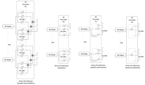 The projection required for obtaining matrix R in step 5 of the precoding algorithm has to be implemented according to the specific analog beamformer [6,20,33,34,35,36,37]. This makes the proposed scheme very generic, allowing it to be easily adapted to different RF architectures. In the following, we will consider a broad range of architectures that can be adopted for the RF precoder for achieving reduced complexity and power consumption implementations. We will consider FC, AoSA and DAoSA structures as illustrated in Figure 2, where we assume single phase shifters (SPS). Besides SPS, we will also consider other alternative implementations for these structures, as illustrated in Figure 3 for AoSA. The different solutions either rely on selectors, switches, inverters or phase shifters, or combinations of these. The overall analog structure is defined as a combination of one of the architectures in Figure 2 with either SPS or one of the alternatives illustrated in Figure 3.