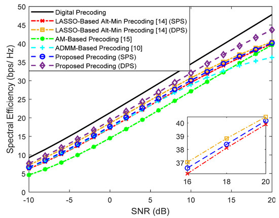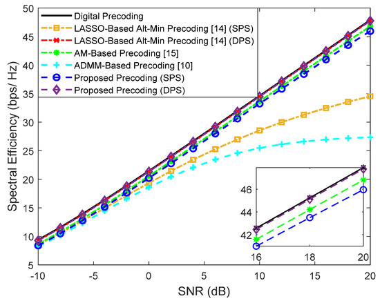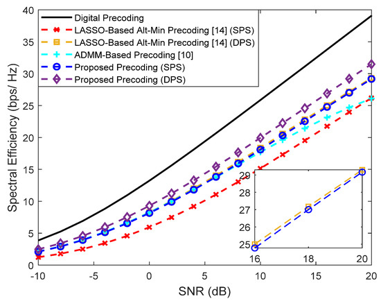 It can be observed that when , only the LASSO-Based Alt-Min with SPS and the ADMM-Based precoder from [10] (which does not remove the inter-user interference) lie far from fully-digital precoder. All the others achieve near optimum results and, in fact, can even match them when adopting DPS (proposed approach and LASSO-based Alt-Min). As explained in Section 2, whereas for we have and designed for that specific carrier, when , has to be common to all subcarriers. While this reduces the implementation complexity, it also results in a more demanding restriction that makes the approximation of (problems (5)–(7)) to become worse. Additionally, when this approximation worsens, there can also be increased interference between users. Therefore, it can be observed in the results of Figure 5, that the gap between the fully-digital precoder and all the different hybrid algorithms is substantially wider. Still, the proposed precoder manages to achieve the best results.