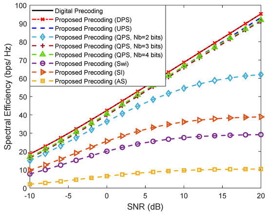 Figure 7 considers a scenario in which we have more than one data stream () being sent from the BS to each user () in a system with , , and . We considered the same penalty parameters configuration: , and . This figure is placed in a perspective of simplifying the implementation of the analog precoder but keeping a fully-connected structure. We can observe that the versions based on DPS and single UPS achieve the best results, as expected. Considering the more realistic QPS versions, the results can worsen but it is visible that it is not necessary to use high resolution phase shifters since, with only 3 bits resolution, the results are already very close to the UPS curve. It can also be observed that the simplest of the architectures, AS, results in the worst performance but the SE improves when the antenna selectors are replaced by a network of switches, or, even better, if branches with inverters are also included.