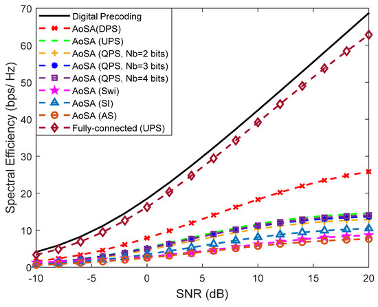 In fact, hereafter, the existence of an LOS component is assumed for the remaining figures of the paper in order to fit the AoSA/DAoSA results to a more typical scenario in the THz band. We can observe that for AoSA structures, the degradation of the SE is notorious, since all candidate versions present worse results when compared to the corresponding fully-connected design and are all far from the fully-digital solution. To reduce the large performance loss due to the adoption of a simple AoSA architecture, we can allow the dynamic connection of more subarrays to each RF chain by adopting a DAoSA structure, as introduced in Section 3.2.