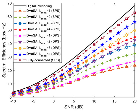 In Figure 9, we study the effect of increasing the maximum number of subarrays that can be connected to an RF chain (Lmax) in the performance of these schemes. Each subarray has a size of 32 antennas (nt). Curves assuming the use of SPS as well as of DPS are included. It can be observed that the increase in the number of connections to subarrays, Lmax, has a dramatic effect on the performance, resulting in a huge improvement by simply going from Lmax = 1 to Lmax = 2. Increasing further to Lmax = 4, the results become close to the fully-connected case, showing that the DAoSA can be a very appealing approach for balancing spectral efficiency with hardware complexity and power consumption. Combining the increase in Lmax with the adoption of DPS can also improve the results but the gains become less pronounced for Lmax > 1. It is important to note that the penalty parameters can be fine-tuned for different system configurations.