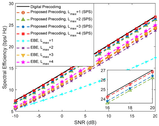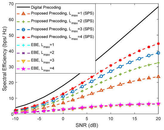 In Figure 10 and Figure 11, we provide a comparison between our proposed precoder and the EBE precoder from [20], considering an architecture based on DAoSAs (with SPS) and a scenario configuration similar to Figure 9, i.e., with , , , and . These figures present various curves where the maximum number of subarrays that can be connected to an RF chain, Lmax, is changed. Figure 10 refers to an SU scenario () whereas Figure 11 corresponds to an MU scenario with . In the SU case, the proposed precoder achieves results very close to the fully-digital precoder, even with only Lmax = 2. Compared to the proposed algorithm, EBE shows a wider gap even though it has a smaller complexity (as presented in Table 2 of Section 3.3).