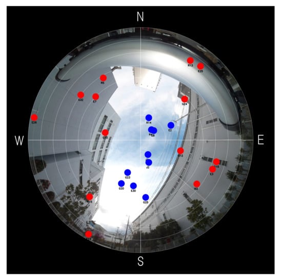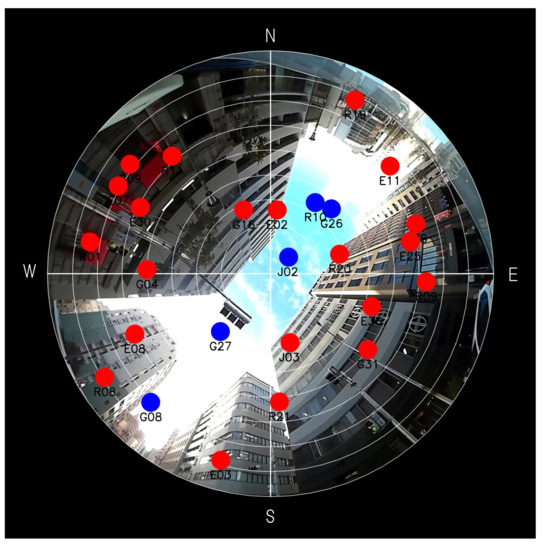A sky plot onto a fisheye-camera image taken at Kobe city, Japan. A blue dot represents a LOS satellite and a red dot represents a NLOS satellite. N, S, E, and W stand for North, South, East, and West, respectively.