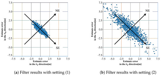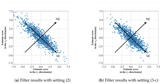 Table 1 shows standard deviations that are computed by projecting the plotted estimate errors to two eigenvectors of , where and are standard deviations in the directions of two eigenvectors, southeast direction and northeast direction. The differences between and mainly comes from the satellite geometry in both (1) and (2). Since there is no model error in these simulations, the plotted estimation errors spread depending on the satellite geometry and the settings of process and measurement noises, and are consistent with the estimation-error covariance calculated from Kalman filter. However, we should note that the values of in (1) and (2) are quite different— and , respectively. This means that the estimation errors in southeast direction are spread more widely than in northeast direction even though the fictitious process noise is added equally in each direction. The fictitious noise to avoid the filter divergence makes the estimation errors worse unintentionally in the southeast direction that corresponds to the eigenvector of the smallest eigenvalue.