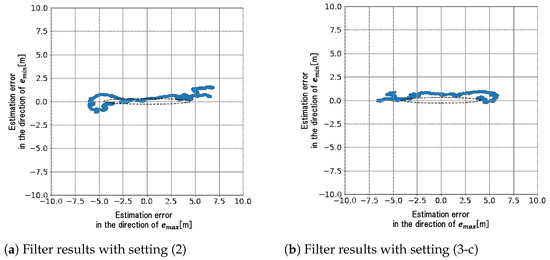 The minimum and maximum standard deviations and of the estimation errors are obtained by calculating the minimum and maximum eigenvalues of . Table 5 summarizes the values of , , and d for the two settings. The following two points can be seen in Table 5: (a) and in setting (3-c) are less than the ones in setting (2), while the values of in both settings are almost the same, and (b) RMSE d in setting (3-c) is also less than the one in setting (2). The first point (a) would indicate that the proposed noise model can suppress the unintentional inflation of estimation-error covariance even for actual data in an urban canyon. From the second point (b), the positioning accuracy with the proposed noise model is also improved compared to the conventional noise model. The estimation errors for the two settings are shown in Figure 6a,b, where the errors are projected to the plane spanned by the unit eigenvectors and that correspond to and , respectively. The ellipsoid in each figure is the contour of probability density function that is supposed to be Gaussian with the standard deviations and in Table 5.