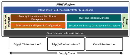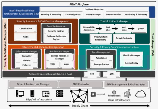 Figure 2 also introduces the proposed functional architecture, where the following four principal functional modules are proposed: intent-based resilience orchestrator and dashboard (IRO), security and certification manager (SCM), trust manager (TM), and the secure infrastructure abstraction (SIA). The figure also shows the key blocks within the SCM module, namely, the secure assurance and certification management, and the enforcement and dynamic configuration, as well as the trust and incident manager, and the security and privacy data space infrastructure, both into the TM module. Starting from top to bottom, the intent-based resilience orchestrator and dashboard (IRO) module is designed to work as the user-centric interface, which is responsible for translating and orchestrating input actions into intents, to be used by other components. The security assurance and certification management is responsible for the provision of the auditable, evidence-based evaluation and certification of the assurance posture of complex ICT systems, based on identified security claims and metrics, setting the roots for the definition of a pan-European process for the certification of devices, processes, and systems, as required in today’s European market. The trust and incident manager provides tools for assessing the security of the stakeholder’s device, component or/and system. The enforcement and dynamic configuration block is responsible for making the entire system cyber-resilient, even when including potentially insecure components, based on the concepts of dynamic self-configuration. The security and privacy data space infrastructure is responsible for the collection and storage of data generated from the devices, processes, and components of the stakeholders’ ICT systems, being part of the supply chain. Finally, secure infrastructure abstraction (SIA) is the infrastructure-centric interface, and it works as a data interface between different edge/IoT or cloud infrastructures and the FISHY platform.