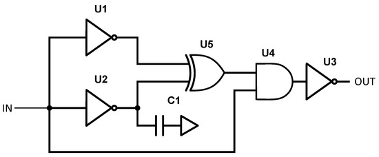 The separation in time between two subsequent pulses in a sequence was fixed by the 20 MHz (50 ns) clock signal used to time the shift registers. The sequence repetition frequency (SRF) was set by the power gating circuit (described in the following). The driving signal that modulated the carrier frequency was a 2 ns baseband pulse generated using the circuit shown in Figure 4. The implementation of short pulses may require very high speed and expensive hardware. Here, by using only discrete logic gates, we were able to maintain very low costs.