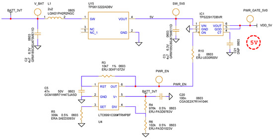 The power gating circuit was the most efficient solution to drastically reduce the power absorption and its schematic is shown in Figure 5. The supply voltage of 3.7 V was obtained from a rechargeable Lipo battery. The battery voltage was up-converted using a switching DC-DC boost converter to 5 V. The higher supply voltage allowed us to obtain a higher RF output signal.