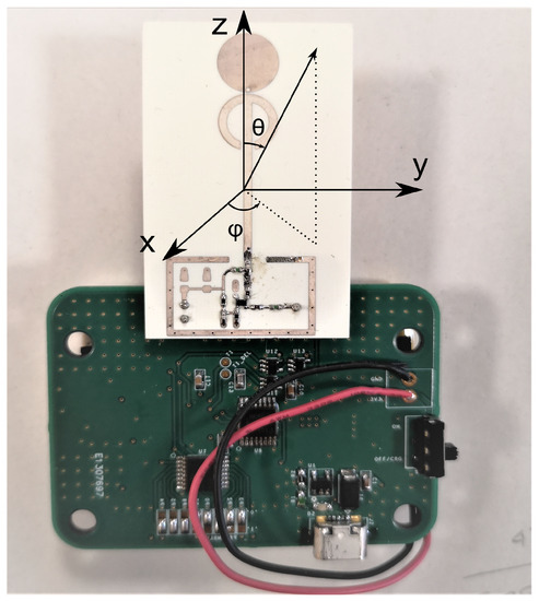 The tag was manufactured, assembled and measured. The final prototype is shown in Figure 9. It was possible to distinguish two different boards connected one on top of the other, the smaller one was the RF pulsed oscillator and antenna PCB while the other was the digital circuit board. The rechargeable battery was positioned on the bottom side of the digital circuit. The whole system dimensions were 75 mm × 55 mm × 10 mm making the whole tag smaller than a credit card. The tag did not require any programming since all parameters were hardwired.