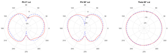 The co-simulation allowed us to estimate the antenna radiation pattern and the shape of the output signal provided to the antenna. The radiation pattern simulated at 7 GHz is shown in Figure 10 with the blue dashed curve. The first two plots represent the and cuts while the third is the equatorial cut (as shown in Figure 9 where the z axis is parallel to the antenna polarization). The antenna main lobe was slightly tilted upwards and radiated almost uniformly in all directions.