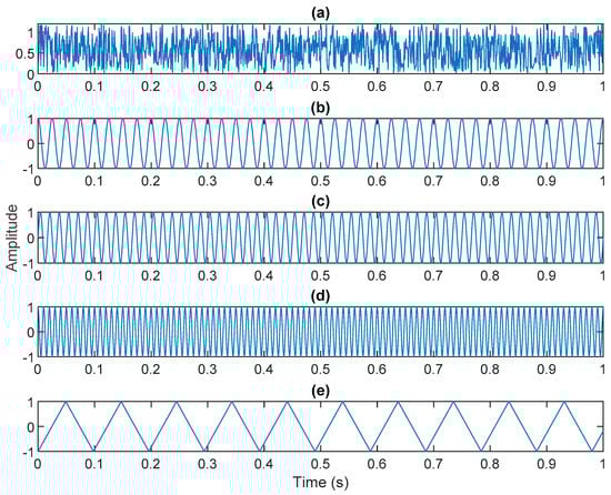 Original sources: (a) white Gaussian noise; (b) 40 Hz cosine waveform; (c) 60 Hz sine waveform; (d) 100 Hz sin waveform; (e) 10 Hz triangular waveform.