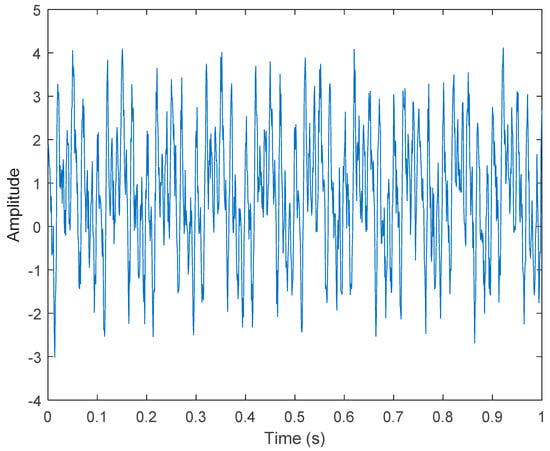 The periodic impact energy caused by the early failure of the electric vehicle motor is weak, and it is relatively difficult to extract the fault characteristics due to the influence of environmental noise and data attenuation. In this article, we attempted to use the VMD method to analyze the early failure data of motor bearings. We first verified the performance and effectiveness of VMD. There were five different characteristics of data , , , , and in the simulation. represents Gaussian white noise. In addition, the fault data , , , and of the electric vehicle motor were 40, 60, and 100 Hz sine and cosine waveforms and 10 Hz triangular waveforms, respectively, as shown in Figure 1. After mixing, four of the original sources were contaminated by Gaussian white noise, as shown below: