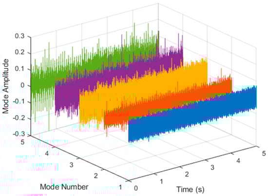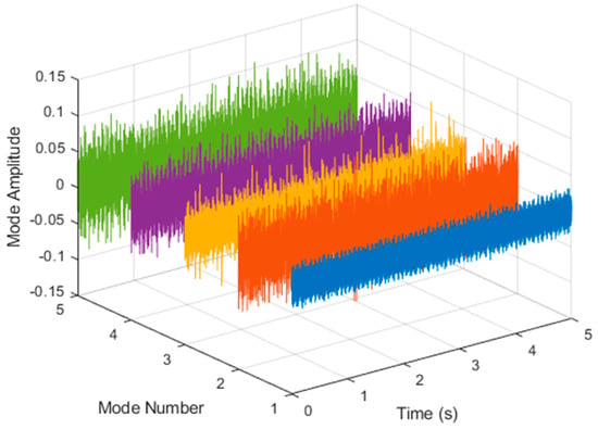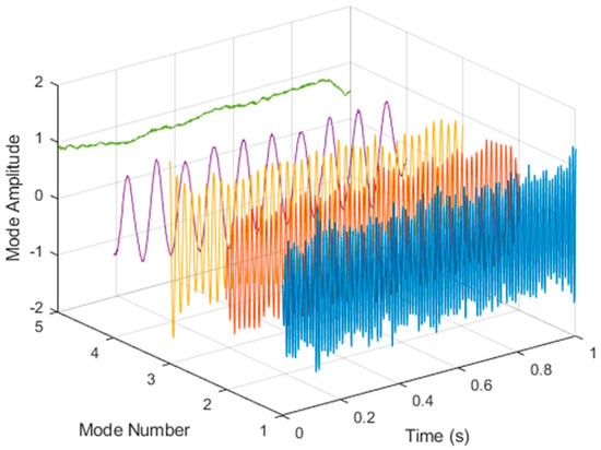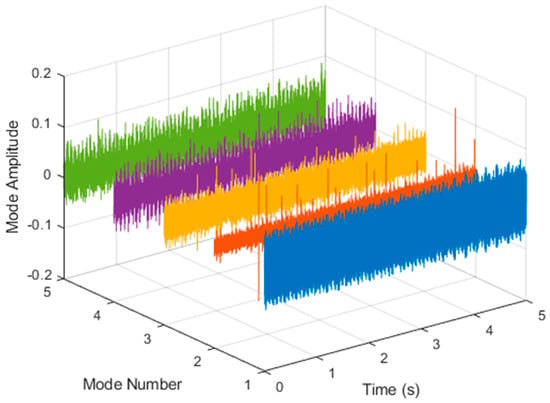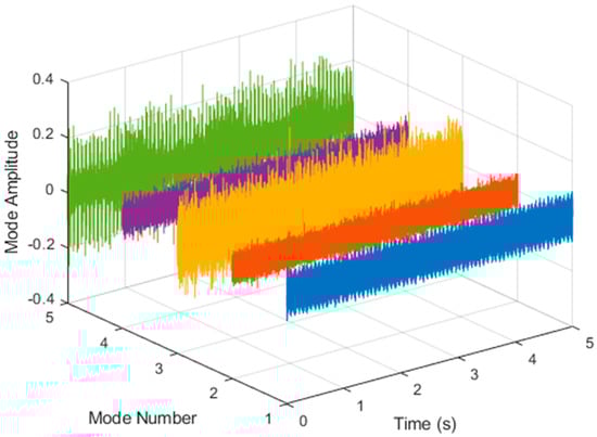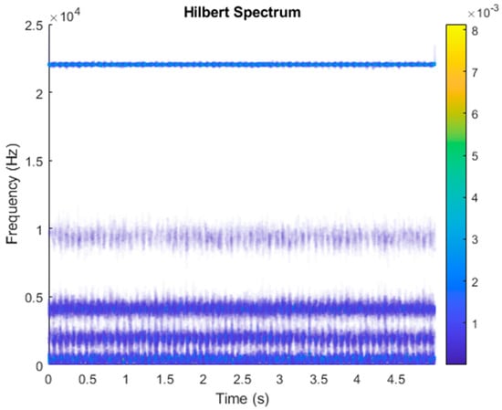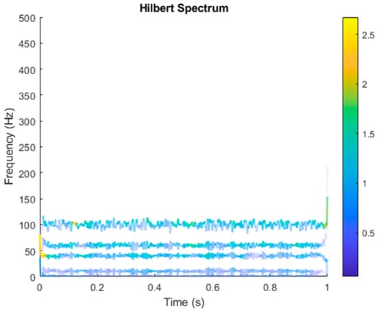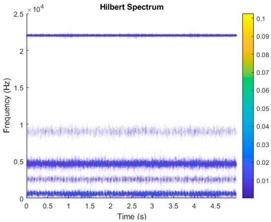 After VMD was used to analyze , the IMF components obtained were then subjected to a Hilbert transform, and the Hilbert marginal spectrum was obtained. Using VMD to decompose x(t), five mode components could be obtained, as shown in Figure 4. They were denoted as ,, , , , and and were very close to the components of the original signal. These five components were transferred to the Hilbert spectrum, as shown in Figure 5. This figure clearly shows the 10 Hz triangle wave and 40, 60, and 100 Hz signals at the bottom of the four components. VMD clearly appeared in the recombined signal, and there was no omission of frequency information. In addition, in the spectrogram of the recombined signal, the high-frequency signal generated by the noise was much flatter than the original signal. This shows that VMD can effectively retain useful information and remove noise.