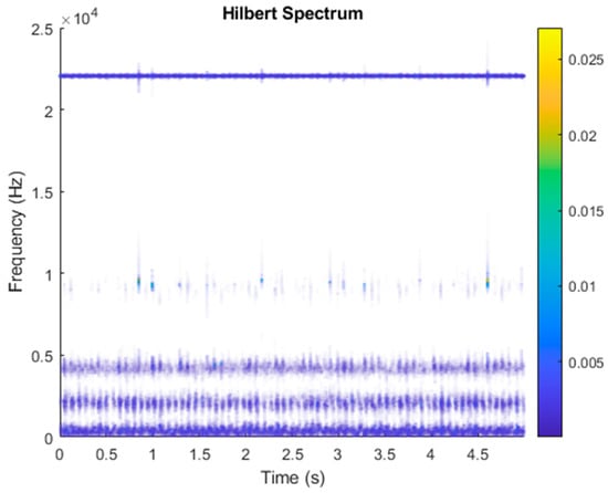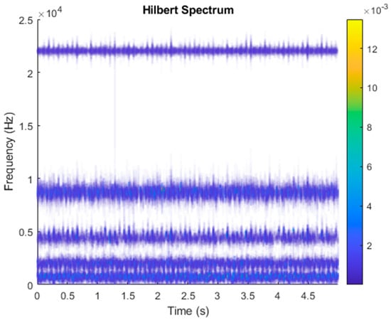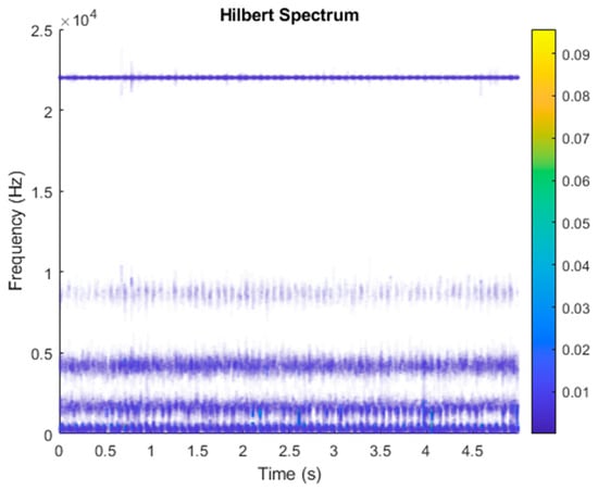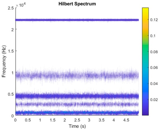 Figure 18 shows the vibration data of an underhung bearing motor failure. First, the VMD decomposition of the underhung bearing motor fault data is shown in Figure 19. The Hilbert transform was performed on each IMF component obtained after VMD processing, and the Hilbert marginal spectrum was obtained. The result is shown in Figure 20. It can be clearly seen from Figure 20 that the IMF Hilbert marginal spectrum of the vibration data processed by VMD had a higher frequency resolution. There were five frequencies for underhung bearing motor failure, the most obvious of which were 22k Hz, 8800 Hz, 4500 Hz, 2000 Hz, and 656 Hz.