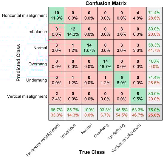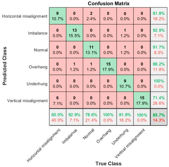 The “Inception module” proposed in the GoogLeNet model adopts a “Split–Transform–Merge” strategy for network design, which can fuse information of different scales, enhance the expression ability of the model, and improve the performance of the model. Its number of training parameters is also several times less than AlexNet, and the accuracy is better. GoogLeNet stacks three types of convolutions with one pooling, which increases the width of the network. After being stacked in this way, more detailed information and features of the input image can be captured. GoogLeNet has the following different characteristics: 1. The pure convolutional layer and pooling layer are changed to the Inception architecture; 2. In the final classification, average pooling is used to replace the fully connected layer; 3. The network includes two auxiliary classifiers to avoid the disappearance of the gradient. Figure 25 shows the GoogLeNet classification result, and the accuracy rate is 85.7%. In the six categories, the classification accuracy rate is 100% for underhang bearing; the lowest is vertical misalignment, for which the classification accuracy rate is 71.4%, and the error rate for horizontal misalignment is 28.6%.