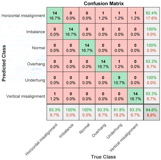 Next, the ResNet101 parameter setting is explained. The algorithm is specified as “sgdm”, which uses the Stochastic Gradient Descent (SGDM) optimizer with momentum. The settings are as follows: Verbose is 0, VerboseFrequency is 30, MaxEpochs is 6, MiniBatchSize is 2, ValidationFrequency is 6, ValidationPatience is 6, InitialLearnRate is 0.000100, LearnRateSchedule is 0, LearnRateDropPeriod is 10, LearnRateDropFactor is 0.10. The learning rate is an important hyperparameter in deep learning. A proper learning rate can make the loss function converge to a local minimum in a short time. Setting the learning rate too low will result in slower network convergence and longer training time, and too large a setting may cause the gradient to oscillate near the minimum or even fail to converge. L2Regularization is 0.0000500, Momentum is 0.96, GradientThreshold is Inf, GradientThresholdMethod is l2norm, the SequenceLength is the longest, SequencePaddingValue is 0, and ExecutionEnvironment is gpu. Figure 26 shows the classification result of ResNet101, and the accuracy rate is 94%. In the six categories, the classification accuracy rate is 100% for imbalance, normal, and underhang bearing, and for horizontal misalignment, the classification accuracy rate is 82.4%. The error classification is 1 each for overhang bearing, underhang bearing, and vertical misalignment. The error rate is 17.6%, and the classification accuracy rate for overhang bearing is 93.3%. When misclassified to 1 for underhang bearing, the error is 6.7%, the vertical misalignment classification accuracy rate is 93.3%, and for misclassification of 1 for horizontal misalignment, the error is 6.7%. After a comprehensive evaluation, the accuracy of AlexNet’s classification result is 75%, and the accuracy of GoogLeNet’s classification result is 85.7%. The accuracy of ResNet101′s classification result is 94%. Therefore, after the VMD analysis was completed, ResNet101 was shown to have the highest classification prediction accuracy rate.