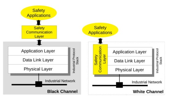A pictorial representation of the two approaches is provided in Figure 1, where on the left side, the communication (black) channel, as seen by the safety communication layer, begins at the boundary with the application layer. With such an approach, although each of the functional safety protocols of IEC 61784-3 has been designed for a specific network, in principle, it could be implemented on whatever network.
