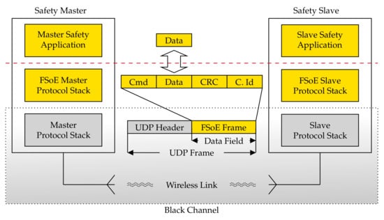 From the architectural point of view, FSNs exploit functional safety protocols logically placed on top of the protocol stacks of wired industrial networks. This is the case, for instance, of the ProfiSafe protocol used in Profibus and Profinet, or of the Fail Safe over EtherCAT (FSoE) in EtherCAT systems. FSNs are expected to be ever more deployed and integrated in the factory communication infrastructures, so that plant safety data and information will become part of IIoT ecosystems and, as such, they will be accessed and elaborated using the new services and tools made available in such a context []. Notwithstanding, FSNs are required to ensure the transmission of safety-related information among nodes with extremely low error probability and bounded reaction times: as a reference, to achieve a SIL 3 (Safety Integrity Level) as specified by IEC 61508, a FSN has to ensure a residual error rate less than h, which is largely lower than what is typically provided by typical industrial networks. This is needed to cope with the strong requirements imposed by safety applications, such as motion control [], automotive [,] and nuclear power energy plants [], to mention some.