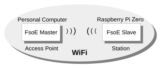 The FSoE stack has been developed and implemented on two different device types, namely a Raspberry Pi board and a PC running the Linux operating system. As can be seen in Figure 3, the FSoE protocol exploited the User Datagram Protocol (UDP) to carry safety data. With such an approach, as evidenced in Figure 3, the black channel comprises the communication medium, the WiFi modules of the adopted devices, and their TCP/IP suites (indicated as protocol stacks) up to the interface with the respective FSoE stacks.