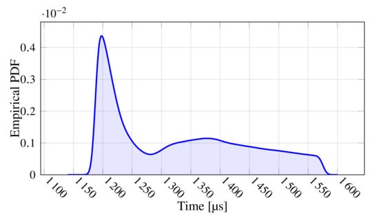During the test, 10 packets were lost in total, resulting in a ratio of lost packets equal to . Concerning the polling time, Figure 5 shows its empirical probability density function (to ease readability, the figure reports data comprised in the interval median ± one standard deviation). As can be seen, the behavior is slightly multi-modal with the main peak centered at about 1200 . It also denotes a considerable jitter, which might prevent the use of this network in the most demanding applications.