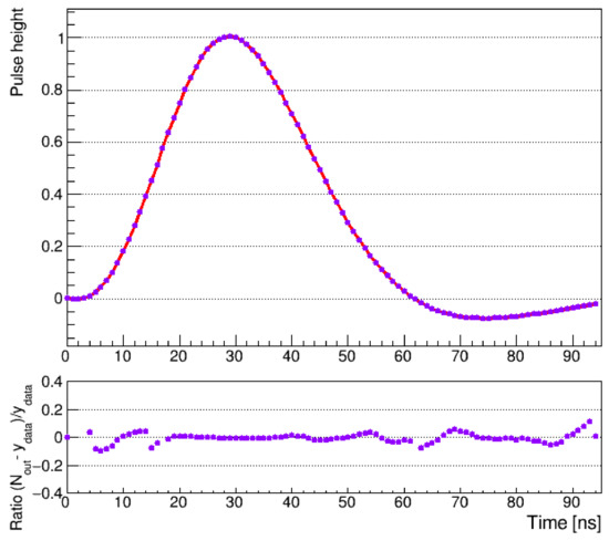 In our analysis, the ROOT implementation of the neural network (TMultiLayerPerceptron [36]) was used, and the fit quality was evaluated using the absolute residuals between the model output and the average of all of the pulses used in the training process. The standard back-propagation learning algorithm was used for training. The optimal structure of the neural network, applied for the analogue pulse shape estimation, was studied using the validation set. Three different architectures were considered with one, two and many hidden layers and with a different number of neurons (nine distinct models were used). It was found that the best results, in our case, were obtained using a network with only one hidden layer and six neurons inside it. The model had the one-dimensional input of the time stamp, while the network processed it further and calculated the amplitude of the standardized shape.