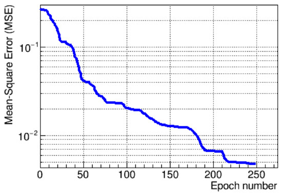 The fit was found to be stable and repeatable, with a typical pattern of residuals distributed around the calculated fit for the testing data set. The fit, along with a ratio of the residuals to the mean pulse shape, is shown in Figure 4. The fit stability was studied as a function of the number of epochs for both training and test data sets, which showed a constant drop of the loss function without oscillations, with the gradual descent presented in Figure 5.