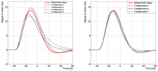 During the studies, the following six specific electronic parameters were taken into account: the preamplifier and shaper bias currents, Ipre and Isha; the gate voltage of preamplifier and shaper feedback p-type MOS transistors, and ; the buffer bias current, ; and the memory readout amplifier bias current, icurrbuf. They are indicated in Figure 2 by violet rectangles. Their impact on the signal processing is complex but can be estimated according to the front-end specification [1]. A change of the nominal configuration can improve some of the readout properties, but usually at the cost of the power consumption or the other stages of the readout. Given this, the idea was to try to slightly decrease the values of the parameters to lower the power consumption of the electronics, balancing on the edge of maintaining the pulse shape. During the studies, a bunch of new proposed configuration settings were proposed. For reference, the default configuration of the Beetle’s nominal settings was used.