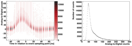 The reconstructed pulse for the real proton–proton collisions is shown in the form of a two-dimensional histogram in Figure 7 (left). Each sample point contains a Gauss–Landau distribution of Analogue-to-Digital counts. To reconstruct the original shape, a Gauss–Landau distribution for each point has to be fitted. The pulse amplitude corresponds to the most probable value of the Gauss–Landau distribution that depends on the average particle energy and the sensor depletion depth.