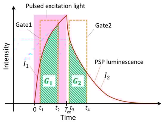 In this lifetime imaging measurement of PSP, two images are captured during the excitation and decay, as shown in Figure 1. The luminescence intensity of and is obtained by integrating and from to and from to , respectively.
