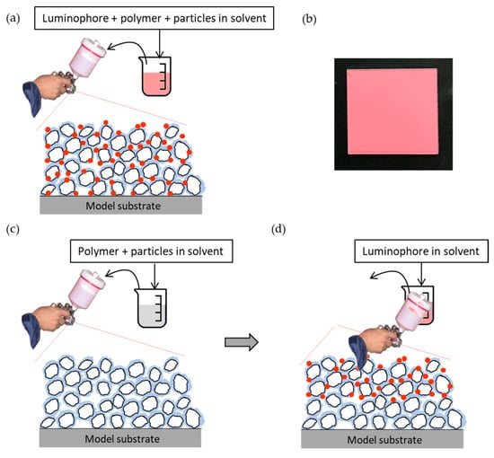 Spraying procedures for fast-PSPs and prepared sample: (a) 1C-PSP and (b) prepared 1C-PSP sample, and (c,d) 2C-PSP: In 1C-PSP, the luminophore, polymer, and particles are applied together to the model surface (a); in 2C-PSP, the polymer and particles, which are the binder material, are first applied (c), and then the luminophore solution is separately overcoated on the binder (d).
