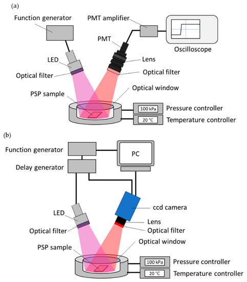 The luminescence lifetime of fast-PSPs was measured using a photo-multiplier tube (PMT). Figure 3a shows a schematic diagram of the lifetime measurement system using the PMT. The prepared PSP samples were placed on a stage in a pressure chamber. By using a pressure controller (PACE5000, Baker Hughes, Houston, TX, USA) and a temperature controller (TDC-1020A, Cell System, Yokohama, Japan), the pressure and temperature in the chamber could be controlled within the range of 1 to 200 kPa and 0 to 50 °C, respectively. PSPs in the chamber were excited with a 390 nm LED (IL-106UV LED, HARDsoft Microprocessor Systems, Kraków, Poland) using an optical lowpass filter of 490 nm (VIS 490, Asahi Spectra, Tokyo, Japan) and a heat absorption filter (HAF-50S-30H, Sigma Koki, Hidaka, Japan). The LED was operated in pulse mode with a function generator (33500B, Agilent Technologies, Santa Clara, CA, USA). The luminescence from PSP was captured by a PMT (H10721-1, Hamamatsu Photonics, Hamamatsu, Japan) with a camera lens (Ai AF NIKKOR 50 mm, Nikon, Tokyo, Japan) and a bandpass filter of 650 ± 20 nm (PB0650-40, Asahi Spectra, Tokyo, Japan). The obtained signal was recorded using a 10 bit oscilloscope (RTB2004, Rohde & Schwarz, Munich, Germany) through an amplifier unit of bandwidth from DC to 1 MHz (C12419, Hamamatsu Photonics, Hamamatsu, Japan). The luminescence lifetime was calculated by fitting the obtained decay curve of the luminescence intensity (I2 in Figure 1) using Equation (6). In this study, the pulse width T of excitation light was set to 10 μs. The averaged luminescence lifetime of PSP with multiple lifetimes can be expressed as shown in Equation (10).