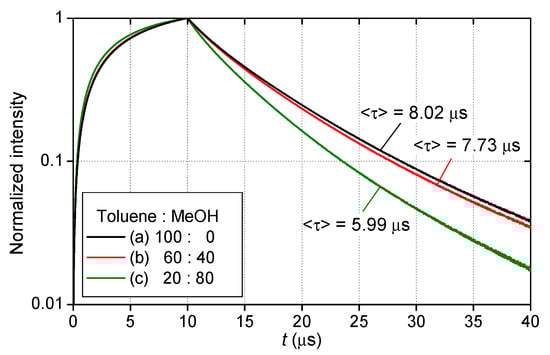 Luminescence waveforms during excitation and decay processes of 2C-PSP (d = 250 nm) prepared with toluene and methanol in the ratios of (a) 100:0, (b) 60:40, and (c) 20:80.