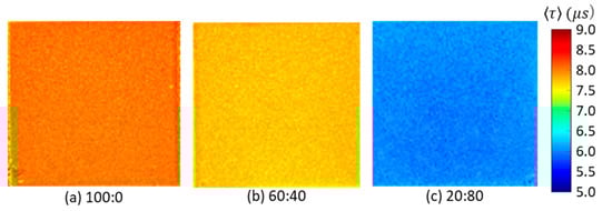 Figure 4 shows the changes in the normalized luminescence intensity of the three 2C-PSPs during the excitation and decay process measured with the PMT in constant conditions of 100 kPa and 20 °C. Figure 5 presents the images of the luminescence lifetime measured by the CCD camera obtained in the same conditions as Figure 4. When the ratio of toluene in the mixed solvent was reduced, the 2C-PSP exhibited lower luminescence intensity and a longer luminescence lifetime. As the toluene percentage decreased from 100% to 20%, the averaged luminescence lifetime decreased from 8.02 µs to 5.99 µs as shown in Table 1; this corresponds to a 25% decrease in . The difference in the solvent’s volatility and solubility of PtTFPP may have affected the distribution of the luminophore in the binder, resulting in differences in the luminescence intensity and lifetime.