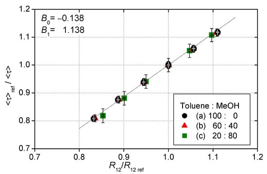 Figure 6 shows the pressure calibration of these three 2C-PSPs. The 2C-PSPs had different luminescence lifetime depending on the solvents but almost the same pressure sensitivity of about 0.6%/kPa. The 1C-PSPs described below also showed nearly the same pressure sensitivity. In other words, an error of 1% in a luminescence lifetime at atmospheric pressure corresponded to a pressure error of approximately 1.6 kPa. Figure 7 shows the relationship between and . The 2C-PSPs exhibited a similar linear relationship between and for this range of test conditions, regardless of the luminophore solvent used.