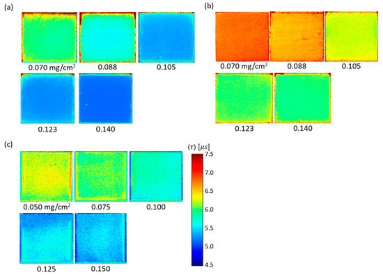Images of the change in with the amount of luminophore applied per sample area: (a) 1C-PSP (d = 30 nm), (b) 1C-PSP (d = 250 nm), and (c) 2C-PSP (d = 250 nm). The layer thickness was h ≈ 10 μm.