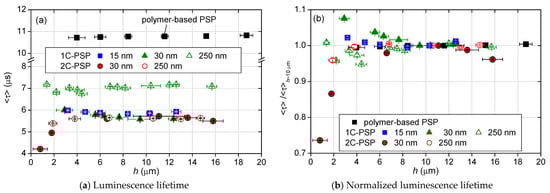 The effect of binder thickness on the luminescence lifetime is discussed in this section. For 2C-PSPs, a constant amount of luminophore per area of 1.0 mg/cm2 was applied regardless of the binder thickness. 1C-PSPs were prepared at a constant luminophore concentration of 1 mg/m for all binder thicknesses. Figure 10 and Figure 11 show the variation in for various thicknesses of 2C- and 1C-PSPs. In Figure 10b and Figure 11, was normalized by the value of at h ≈ 10 μm. The results of the polymer-based PSP are also presented for comparison. The polymer-based PSP showed almost a constant luminescence lifetime independent of the binder thickness because the luminophore density in the binder was constant regardless of the binder thickness. On the other hand, 2C-PSP shows a shorter luminescence lifetime at thicknesses less than 8 μm. In particular, 2C-PSPs with d = 30 nm at h = 0.8 and 1.8 μm had 26% and 13% shorter than that at h = 11 μm, respectively, as shown in Figure 10b. 2C-PSP with d = 250 nm at h = 0.8 μm also showed 4.1% shorter . Since a certain amount of luminophore was applied to the thin binders, the luminophore density in the binder of 2C-PSP increased, resulting in shorter luminescence lifetimes.