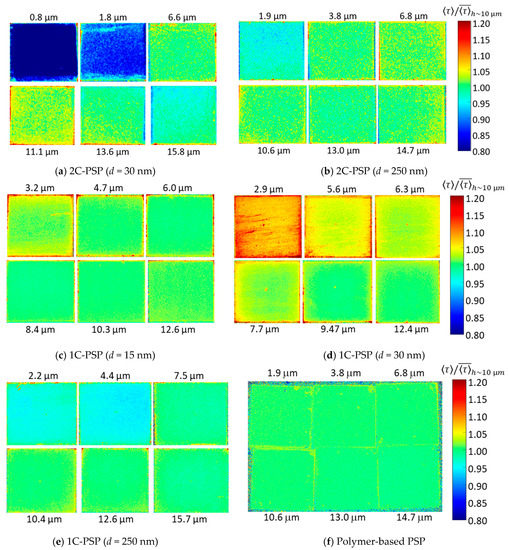In this section, the depth variation of for 2C- and 1C-PSPs is discussed. First, 2C-PSP with d = 250 nm and h = 16.2 μm was prepared. Then, it was sanded to a thickness of 13.8 μm (83.8%) and then to 8.5 μm (53.3%) using 2000 grit lapping film (3M 261X). The change in between the surface and inside of the binder was compared in Figure 12 and Table 2. The lifetime was normalized with averaged at h = 16.2 μm before sanding. The luminescence lifetime inside the binder at h = 13.8 and 8.5 μm was 6.2% and 5.1% longer than that of the surface (h = 16.2 μm) (see Table 2). In 2C-PSP, the luminophore solution was applied onto the binder surface, which increased the luminophore density near the surface and shortened .