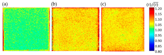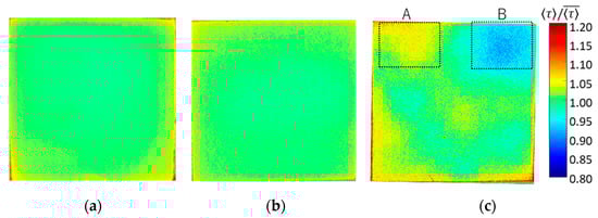 On the basis of the above results obtained with 15 × 15 mm2 samples, the uniformity of the luminescence lifetime distribution was evaluated with 16-fold larger samples of 60 × 60 mm2. Three samples were prepared: (a) 1C-PSP with d = 30 nm and h ≈ 10 μm, (b) 2C-PSP with d = 250 nm and h ≈ 10 μm, and (c) 2C-PSP with d = 250 nm and h < 10 μm. In samples (a) and (b), fast-PSP was applied with a thickness of about 10 µm to reduce the effect of the binder thickness variation on the luminescence lifetime. On the other hand, the binder of sample (c) was coated nonuniformly in the range of 6 µm or less, where the effect of binder thickness on luminescence lifetime was significant. The top-coated luminophore solution was also applied unevenly. The spatial normalized distribution of these samples (a)–(c) are shown in Figure 14 and Table 3. Samples (a) and (b) show a small variation standard deviation of 1.1% in luminescence lifetime, while sample (c) shows a larger 3.3%. In addition, the luminescence lifetime was 2.7% longer in region A and 5.8% shorter in region B of sample (c).