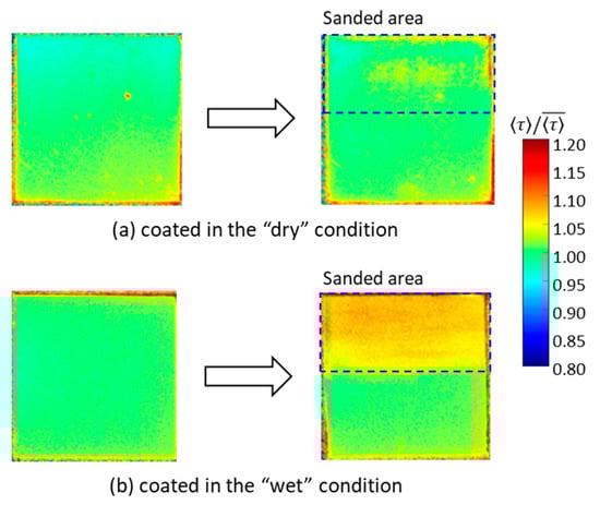 The sanded area showed longer compared to the surface. In particular, 1C-PSP coated in the “wet” condition showed a significant difference in between the surface and inside of the binder; the inside the binder in the “dry” and “wet” conditions was 2.0% and 6.2% longer than that of the surface, respectively. These results show that, even in 1C-PSP, where the luminophore and binder materials are coated simultaneously, can vary in depth direction depending on the coating conditions. The luminophore density may not be uniform in the depth direction because the luminophore and polymer move to the surface during the drying process. These results suggest that polishing to reduce the surface roughness may increase the variation of PC-PSP, especially 2C-PSPs, because the may vary in the depth direction.