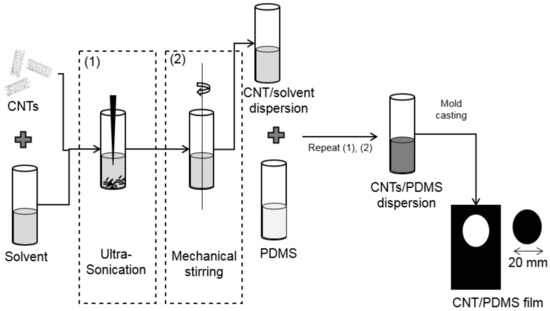 Dispersion of multi-walled carbon nanotubes (MWCNT) in PDMS is essential to utilize the full potential of the MWCNT in the polymer [48]. Effective dispersion of MWCNT in PDMS is still a challenging aspect due to the van-der-Waals attraction force between the MWCNT, which tend to bundle and/or reaggregate the MWCNT [48]. In this work, sonication, melt mixing, and solution processing are adapted to use nanocomposites efficiently. Among these, sonication plays a vital role in debundling MWCNT, imparting high shear stress. However, it may reduce the aspect ratio of MWCNT, which should be controlled and monitored. Melt mixing can disperse MWCNT in the matrix homogeneously by providing uniform shear stress. Since PDMS is highly viscous, it is challenging to disperse MWCNT in it homogenously. It can be achieved by a solution processing approach, where an organic solvent is used to disperse in MWCNT later in PDMS. Tetrahydrofuran is selected as the common organic solvent, where it can efficiently disperse the MWCNT in PDMS [49,50]. MWCNT with outer diameter 6–9 nm, an average length of 1 m and carbon purity of >95% purchased from Sigma-Aldrich is used as conductive nanofillers, PDMS (Sylgard 184 Kit) were purchased from Dow Corning. 0.3 wt. % MWCNT is mixed with tetrahydrofuran (THF) is sonicated using Bandelin Sonopuls HD 3200, then magnetically stirred using CAT M27, followed by mixed with PDMS (1:1).