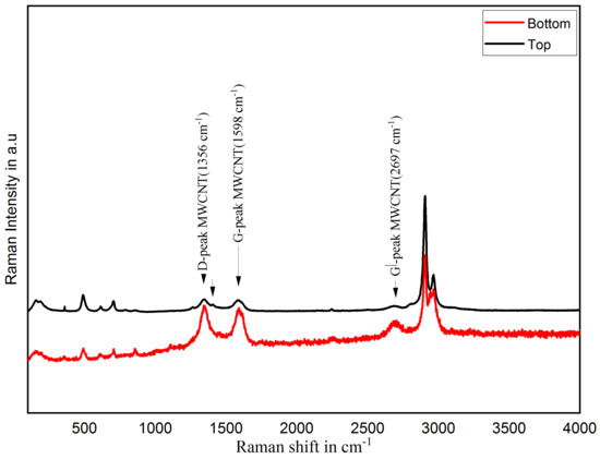 In this section, material composition is analyzed to the investigated homogenous distribution of MWCNT in PDMS matrix using a non-destructive technique called Raman spectroscopy using Renishaw inVia Raman microscope. MWCNT/PDMS composite films were scanned in extended scan mode for 10 s on the top and bottom side of the cross-section of film using a green laser source with a power of 1 mW and wavelength of 532 nm. Figure 2 shows the Raman spectra of the MWCNT/PDMS nanocomposite films.