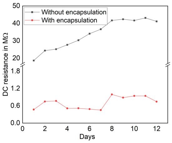 DC resistance of with and without encapsulation of the MWCNT/PDMS pressure sensors over day.