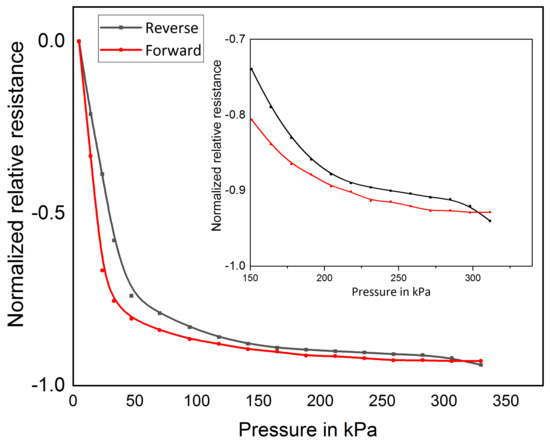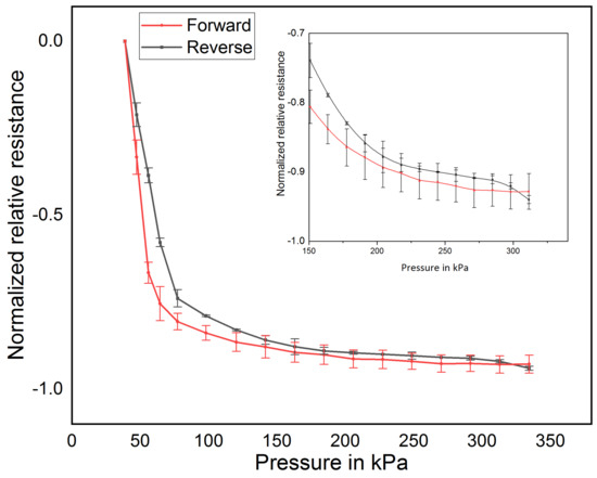 Sensor behavior for forward and reverse force cycle. Inside: Sensor behavior for pressure of 150 to 330 kPa.