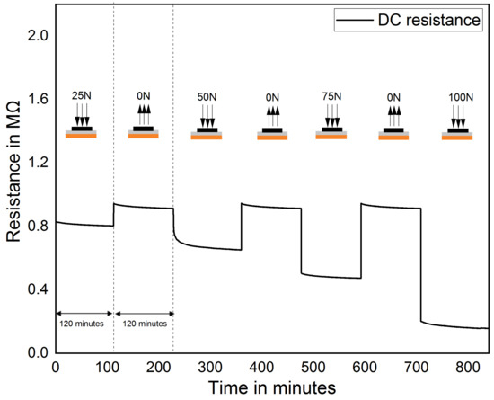 where d is the distance between MWCNT, h is the Planck constant, e is the quantum of electricity, l is the barrier height of energy, m is the electron mass, and A is the cross-sectional area of the tunnel [52]. During the initial applied force of 1 N, the nanocomposite thin film comes in contact with the underlying electrode, resulting in an abrupt decrease in resistance of the sensor. So, the sensor needs an activation force of 1 N to provide a stable measurement. Further increases in force result in further decreases in resistance. It can be explained by the Equations (1) and (2), where a change in orientation of conduction path results in a change of R, change in tunneling distance results in a change of R, which in turn change the junction and deformation of MWCNT change in R, which results in overall resistance decreases [28].