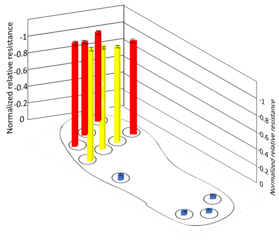 Which is approximately 160–250 kPa of pressure applied on it. There are no measurable changes in other sensors because those sub-areas are not in contact with the ground. Figure 14 shows the average of normalized resistance for three cycles in position B. The pressure distribution is evenly distributed in all sub-areas, where the normalized resistance of the sensors ranges −0.6083–−0.8091(±0.0045–0.0061). The pressure distribution is approximately 70–90 kPa, 50–60 kPa, and 100–150 kPa in the heel, midfoot, and forefoot, respectively. However, slightly more pressure is applied on the sensor (S9, S10, S11) than other sensors in the forefoot, this might be that the body is slightly moving towards the forward direction in this position. Figure 15 shows the average of normalized resistance for three cycles in position C. The pressure distribution is more in the forefoot, where normalized resistance of the sensors (S5–S11) ranges −0.78283–−0.90316(±0.0025–0.0057), which is approximately 160–250 kPa. There are no measurable changes in sensors in the midfoot and heel because those sub-areas are not in contact with the ground.